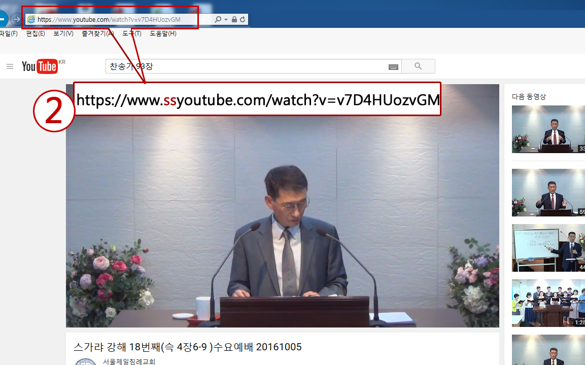 2¹ø :  ÁÖ¼ÒâÀÇ youtube ±ÛÀÚ ¾Õ¿¡ ss¸¦ ÀÔ·ÂÇÏ°í ¿£Å͸¦ Ĩ´Ï´Ù.